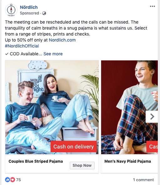 Let’s take the Newsfeed for example (Facebook and Instagram). This is the most native form of ads within Facebook itself. The only you would recognize this as an ad is because of the “Sponsored” written on the top left of the ad itself. These kinds of ads blend in with other posts on your newsfeed, and that’s a perfect thing. But the sad thing is, you won’t be able to stand out and grab attention. Take a look at the ad below, these had shown up on my newsfeed, and they have done quite a few things correctly.